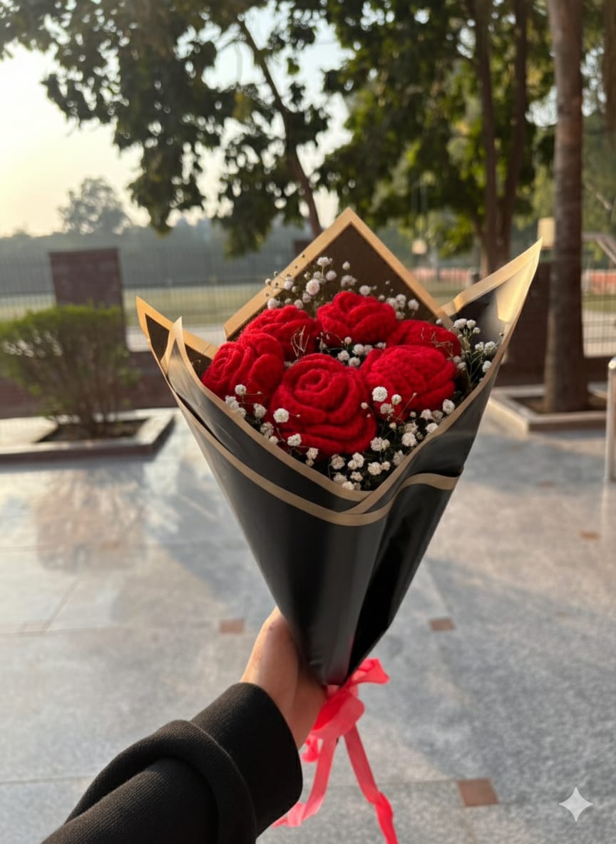 This beautiful bouquet is made with hand-crocheted red roses arranged with delicate white fillers and wrapped in a premium black-golden sheet.